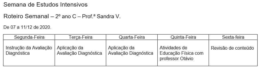 Roteiro Semanal - De 14 a 18 de dezembro de 2020.